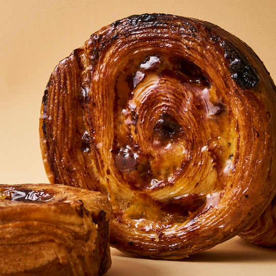 Un pain aux raisins composé d'une base de brioche feuilletée au beurre généreux, garnie de crème pâtissière vanillée et de raisins secs !