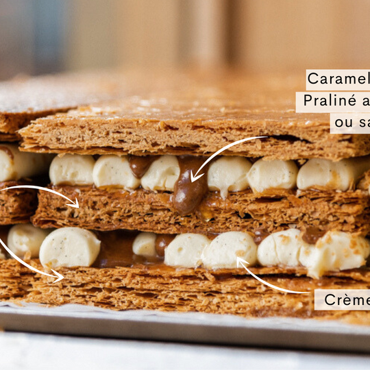 Un feuilletage inversé qui fond dans la bouche et une crème pâtissière généreusement vanillée le tout sublimé par un praliné maison 69% de fruits secs (amandes et noisettes) et son caramel au beurre salé, nos millefeuilles à partager s'invitent à la table des grands desserts !